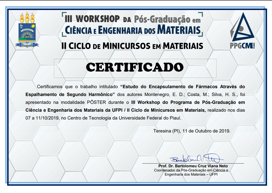 Apresentação do pôster intitulado “Estudo do Encapsulamento de Fármacos Através do Espalhamento de Segundo Harmônico” durante o III Workshop do Programa de Pós-Graduação em Ciência e Engenharia dos Materiais da UFPI , realizado no Centro de Tecnologia da Universidade Federal do Piauí.
