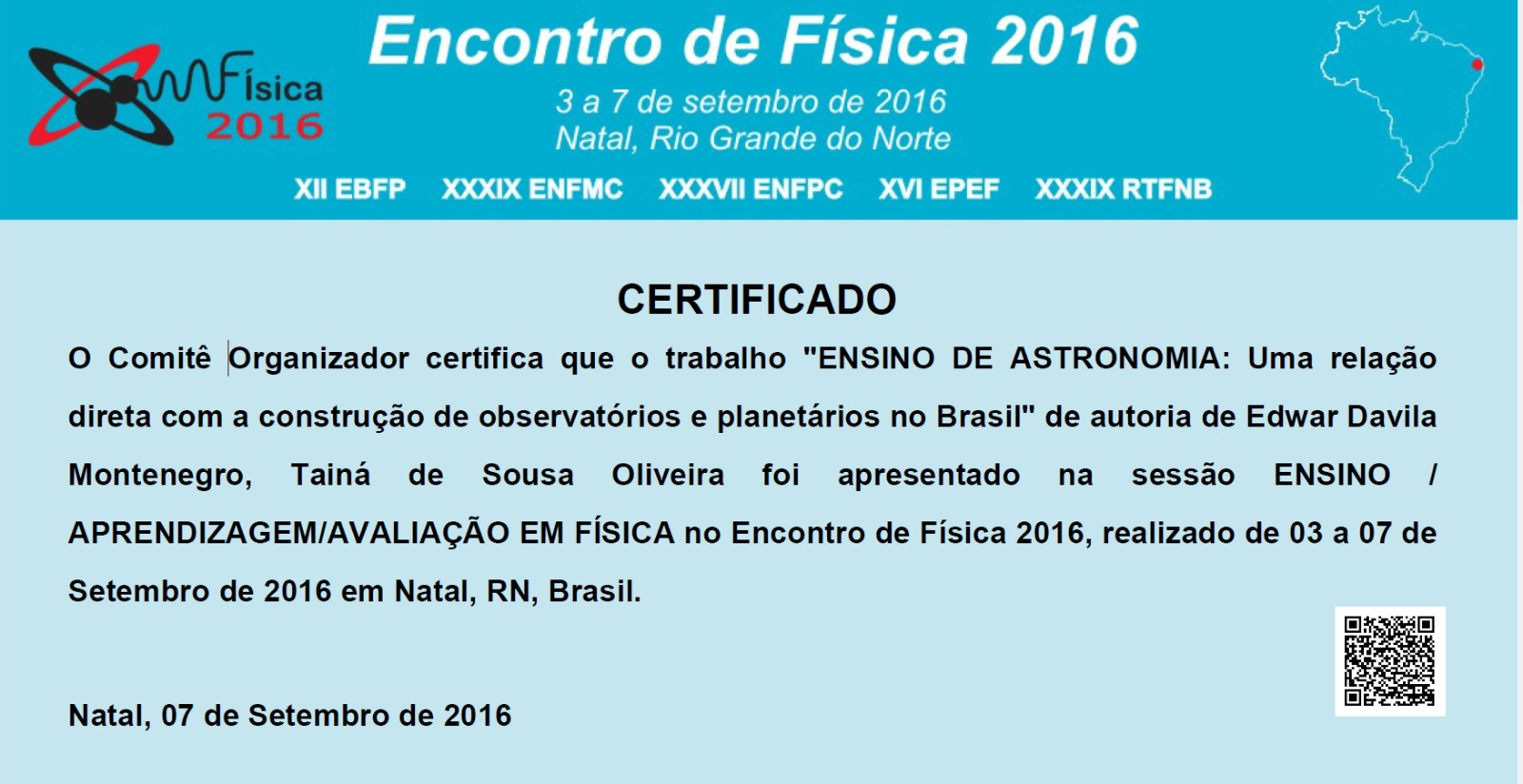 Apresentação do trabalho “ENSINO DE ASTRONOMIA: Uma relação direta com a construção de observatórios e planetários no Brasil” na sessão de Ensino/Aprendizagem/Avaliação em Física durante o Encontro de Física 2016, realizado em Natal