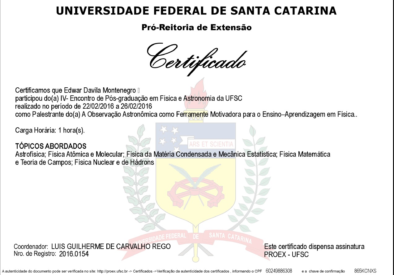 Apresentação do trabalho “A Observação Astronômica como Ferramenta Motivadora para o Ensino–Aprendizagem em Física” durante o IV Encontro de Física e Astronomia da UFSC, realizado em Florianópolis, SC.