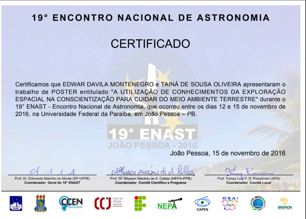 Apresentação do poster “A UTILIZAÇÃO DE CONHECIMENTOS DA EXPLORAÇÃO ESPACIAL NA CONSCIENTIZAÇÃO PARA CUIDAR DO MEIO AMBIENTE TERRESTRE” durante o 19º ENAST, na Universidade Federal da Paraíba, em João Pessoa – PB