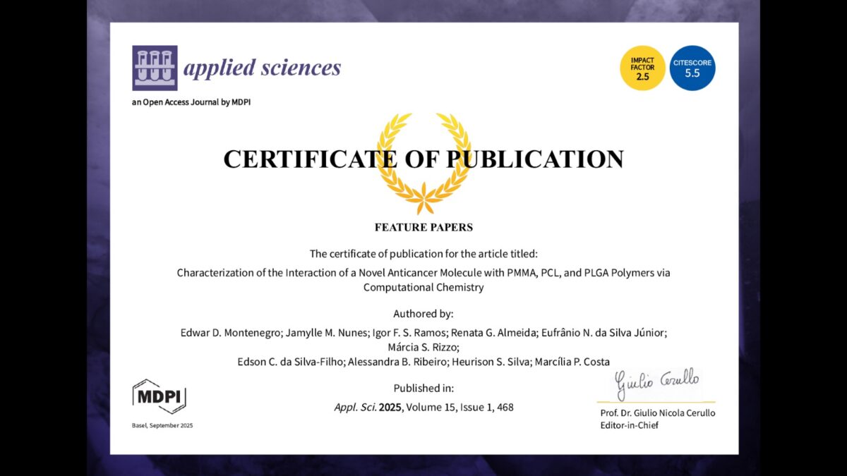 Publicação como autor do artigo científico “Characterization of the Interaction of a Novel Anticancer Molecule with PMMA, PCL, and PLGA Polymers via Computational Chemistry” na revista internacional Applied Sciences.